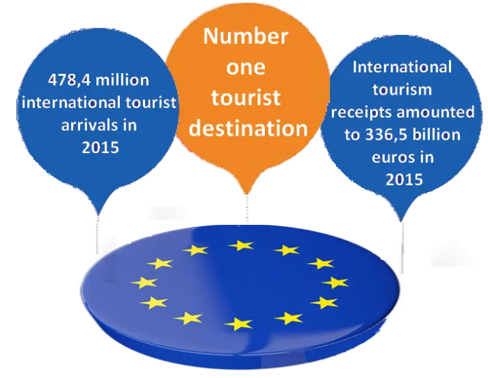 Europe keeps being the number one tourist destination, although its market share significantly decreased from over 60% in 1990 to 51% in 2015. The European Union alone counted 478,4 million international tourist arrivals in 2015, translated in a total share of 40,3%.